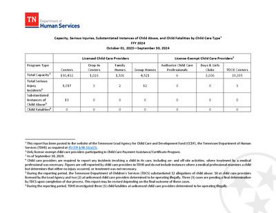 Capacity, Serious Injuries, Substantiated Instances of Child Abuse, and Child Fatalities by Child Care Type, FFY 2024