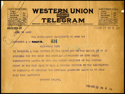 In the telegram, President Wilson asked Gov. Roberts to call a special session of the Tennessee legislature in order to consider the women's suffrage amendment.