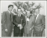 The photograph was taken during the filming of "Davy Crockett, King of the Wild Frontier." Part of the movie was filmed at the State Capitol. Governor Clement is second from left and Walt Disney is second from right.