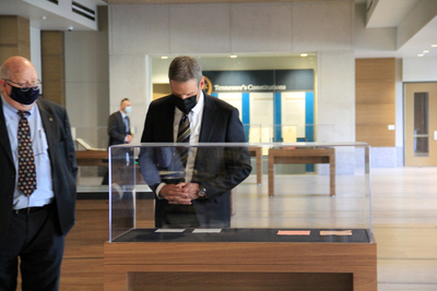 Photograph of Gov. Lee viewing an exhibit case in the lobby of the new Library & Archives building
